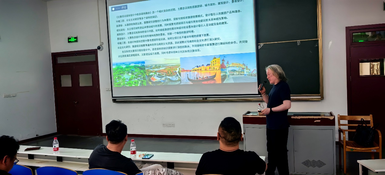 环艺系另外两个讲座同期进行,分别由深圳华辉建筑装饰设计院院长、总设计师、东华大学研究生校外导师刘革胜和上海鼎煌酒店建筑工程设计有限公司总设计师、研究生校外导师岳建仁教授进行讲座。刘革胜院长以《设计青春-创意无限》为讲座题目,系统介绍了其个人从业经历和丰硕的设计成果。岳建仁教授以《文旅项目规划设计中的多学科融合》为题,阐述了文旅景观多学科融合的可能性与案例解读,用设计师视角探讨了景观设计未来发展。